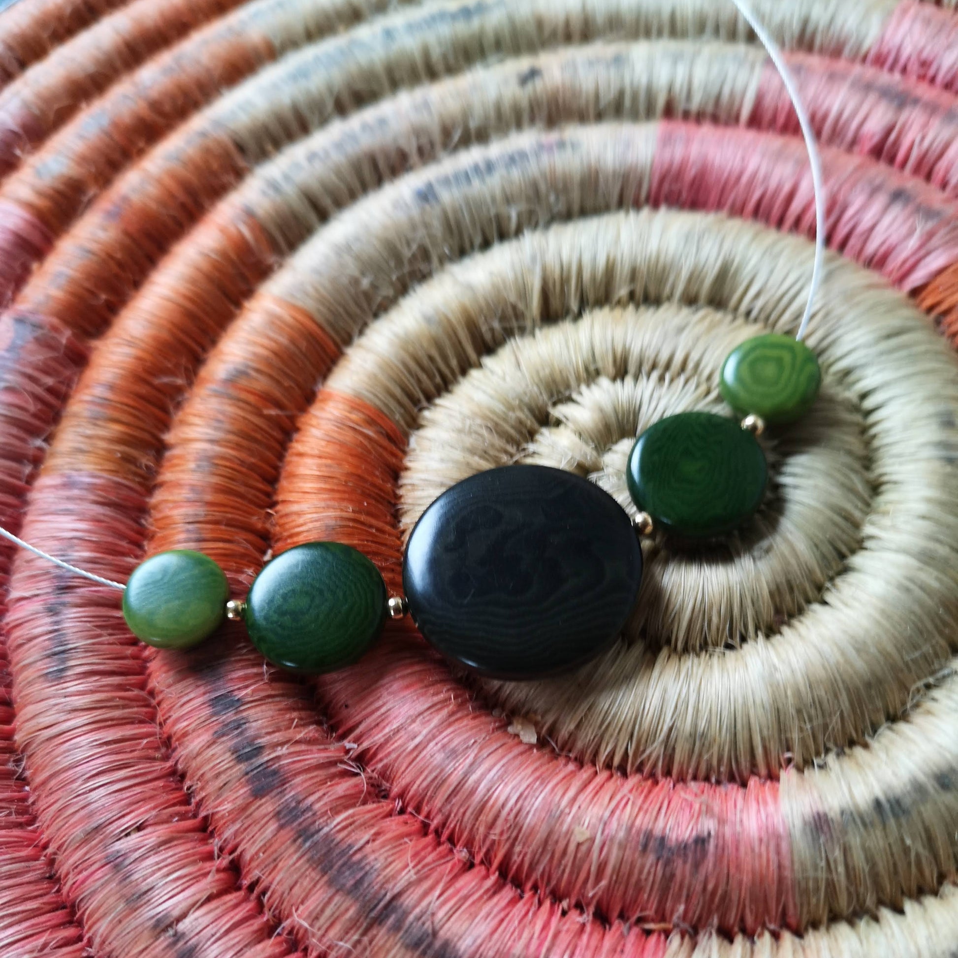 Five planets in orbit, represented by colourful vegetable ivory pieces separated by silver spacers. A minimalist cosmic design.