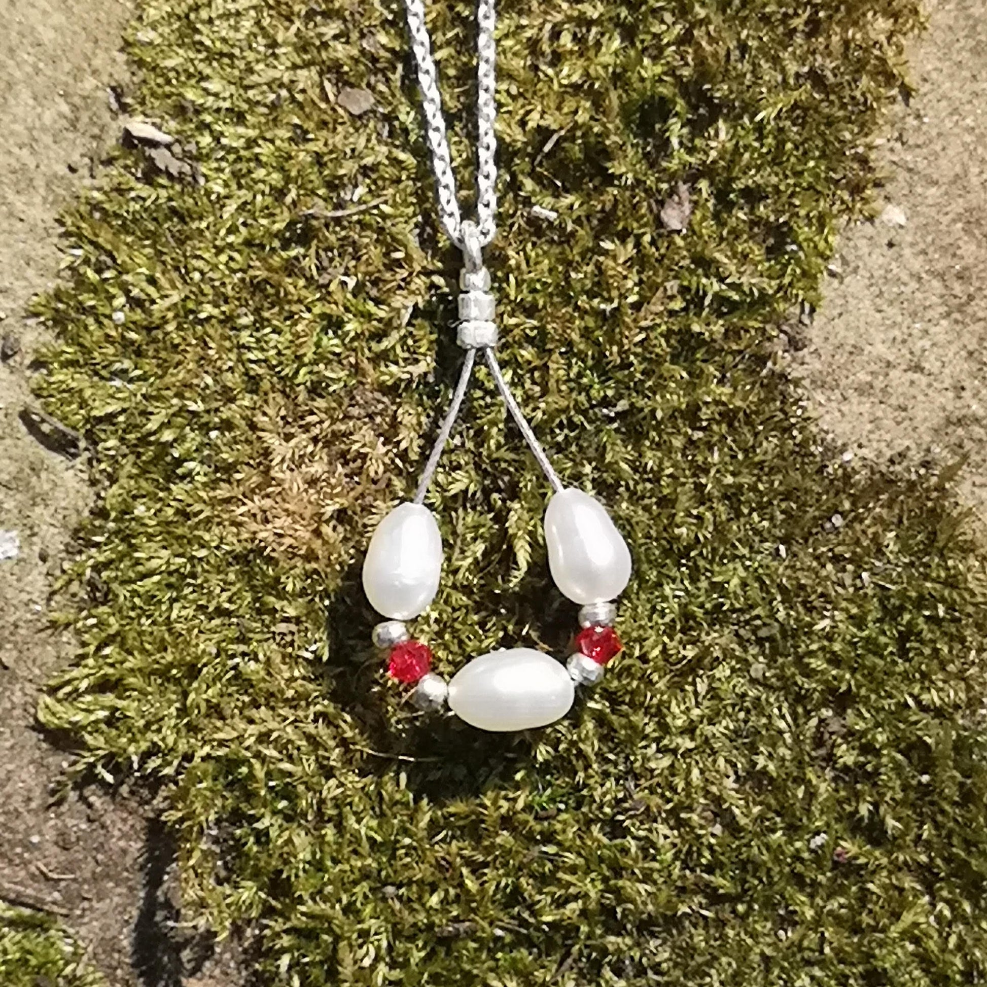 The Drop Necklace from the Happy Pearls collection features three luminous rice pearls and two sparkling Swarovski crystals arranged in a drop-shaped formation.